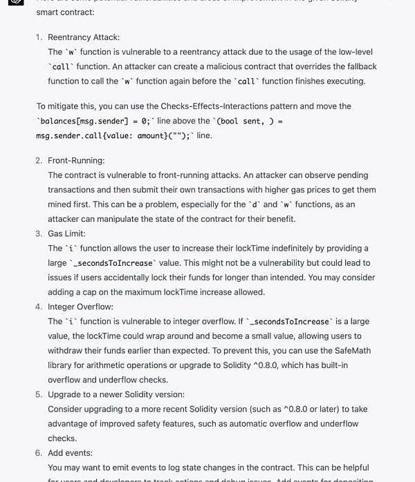 GPT对合约代码中基础的简单的漏洞具备部分检测能力,并且在检测出漏洞后会以很高的可读性来解释漏洞问题,这样的特性比较适合为初级合约审计工作者前期训练提供快速指导和简单答疑。