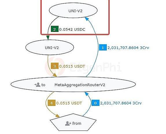 在恐慌挤兑潮和一片市场混乱中,代币价格出现剧烈波动,MEV搜索者反而能够看到获利机会。而成为MEV目标的受害者,则可能不幸承受巨额损失。在本轮USDC挤兑潮中,就出现了一例这样的MEV套利事件。一位地址开头为0x8ff的投资者试图转换其稳定币仓位,想要将其持有的203万个3CRV代币换成USDT,但其并未直接通过Curve解除LPtoken,而是经由KyberSwap聚合路由将交易发送给了Uniswap上的一个几乎完全没有流动性的LP,这个资金池在过去的251天里一直处于闲置状态。