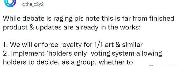 虽然之后X2Y2官方紧接着表示:0%版税绝不是前进方向,并在11月取消「灵活版税」设置,强制执行所有NFT的版税,但在当时这一举动成为了人们对项目方收益口诛笔伐的导火索。