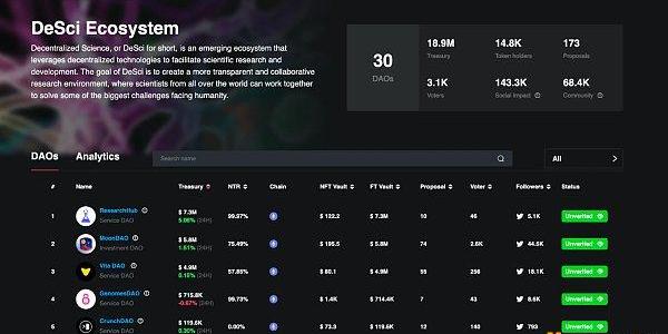 其中,DAO?的比例最大,占?29%?,其次是?Protocols&Data、DecentralizedFundingofScience、BIOTECHResearch、Communities。目前,DeSciDAO?排名最高的资产是?ResearchHub,其国库总价值超过?600?万美元,但其原生代币比例超过?99.96%?。除去原生代币占比之外,VitaDAO?在国库方面的排名将是第一。最活跃的治理属于?MoonDAO,总共有?74?个提案和?10102?票的累积,其次是?VitaDAO?和?CrunchDAO。DeSciNFT?系列作为一个整体现在并不活跃,最受欢迎的系列是?GENETICATSNFT,目前价格为?0.13?ETH?作为底价。