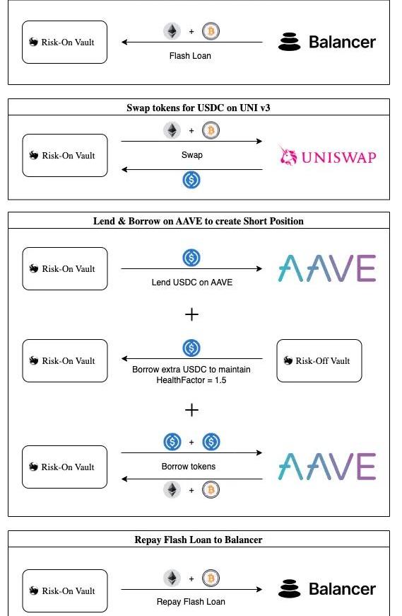 用户将sGLP或USDC存入Risk-OnVault,该金库在Balancer上通过闪电贷借出BTC和ETH,并在Uniswap上出售成USDC,出售获得的USDC连同Risk-OffVault的USDC会被存入AAVE再借出BTC和ETH,这些BTC和ETH会被用来偿还Balancer的闪电贷。这些操作将在AAVE上创建了一个空头头寸,因为Risk-OnVault现在借入了BTC和ETH。