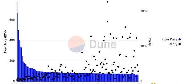 即使稀有的性状与底价相关,但也不是唯一影响因素,因为有些性状或性状的组合能获得更多的文化意义。在BAYC性状Dune仪表板中,我们分析了BAYC性状和性状类别与其市场价值之间的关系,并探索了市场价值与稀有性之间的关系。