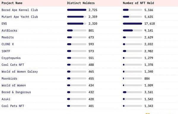 除了MAYC和BAKC之外,ENS、Artblocks、CloneX、10KTF、CoolCats、WorldofWomenGalaxy和Moonbirds是大多数BAYC持有者同时拥有的非Yuga类NFT。