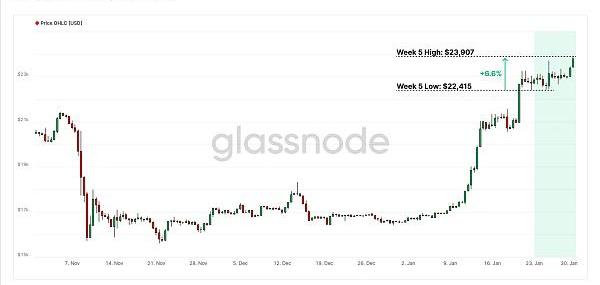 本周数字资产持续上涨,比特币价格在1月29日晚间达到2.39万美元的高位。2023年1月创下自2021年10月以来的最佳月度价格表现,年初至今增长达到43%以上,处于2022年8月以来的最高水平,较每周低点2.24万美元上涨了6.6%。