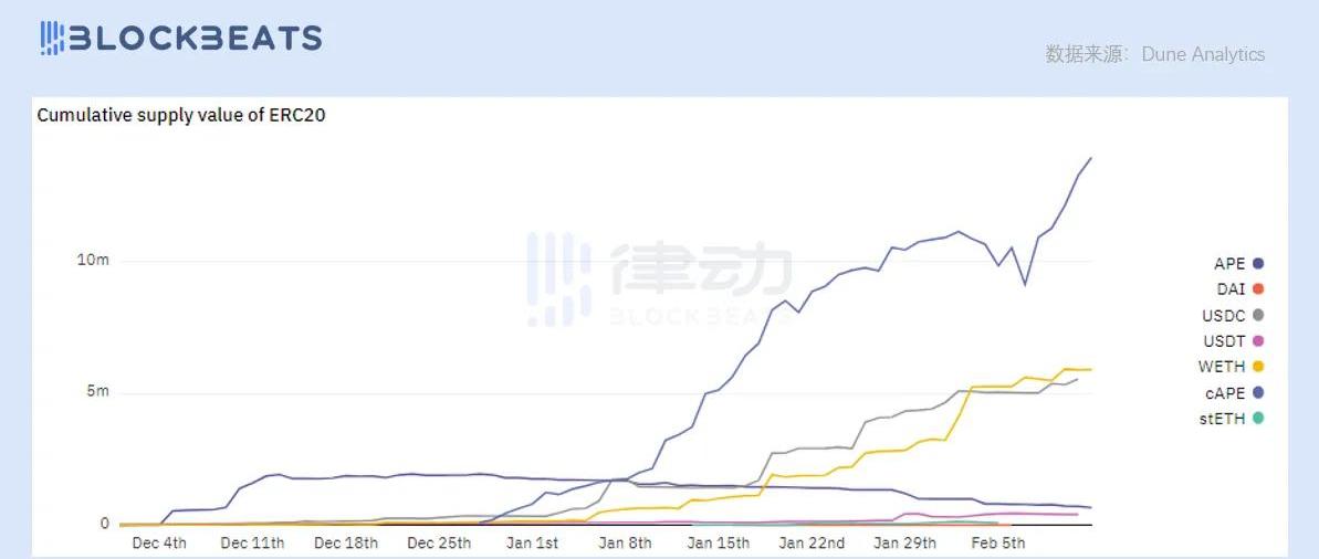可以看到,对于NFT的「点对池」借贷模式通过实现「NFT的即时借款」在一定程度上改善了NFT流动性不足的问题,因而使用这个模式的BendDAO在NFT借贷业务上更受用户欢迎。但是对于ApeCoin的借贷则是另一种情况了。