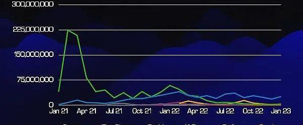 此图表包括当时所有体育NFT项目的一级和二级销售。其中,DapperLabs的销售额在2021年和2022年都约为1亿美元。