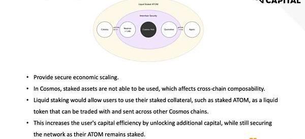 目前Cosmos的质押需要锁定21天,质押者必须放弃其他可能更有价值的资金用途,资产将被限制在质押所在链,导致了对跨链可组合性和资本效率的限制。尤其考虑到Cosmos需要抵押很大比例Token以确保安全性,极大限制资产流动性及用途。