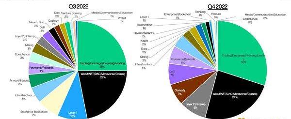 发生在Web3领域的投资占据了大多数,而与“交易”相关投资金额占比更高。Web3领域的融资继续引领着VC投资,占到2022年第四季度所有完成交易的30%以上,大量早期公司正在Web3领域进行构建,特别是在NFT子领域。此外,为交易、投资构建平台与工具的公司继续在融资金额方面占据主导地位,这表明市场基础设施在加密生态系统中的重要性和日益成熟。