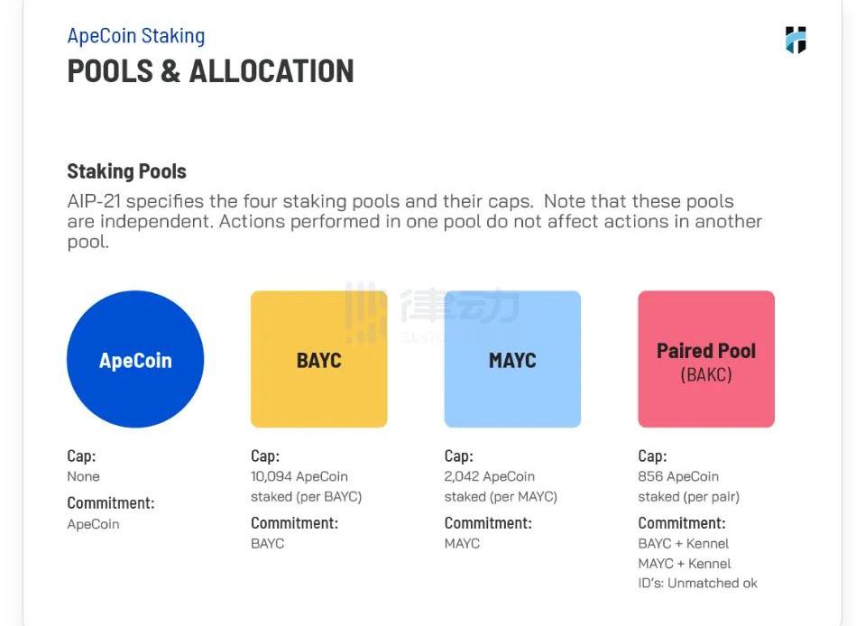 12月6日,负责创建ApeCoinDAO质押系统的HorizenLabs官方宣布,ApeStake.io已正式上线并开启APE存款。ApeStake.io的质押挖矿系统是将用户资产按照类别划分为4个池子,即ApeCoin池、BAYC池、MAYC池、BAKC配对池,用户需要分别持有每个池子要求的资产去自行配对,可以描述为「独立组合质押挖矿」。