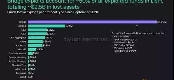 TokenTerminal报告显示,Defi大约50%的漏洞发生在跨链桥上,其次为借贷,交易平台和机池。