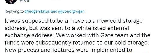 如果说第一件事还能理解,第二件事就显得疑点重重。11月13日,推特用户@jconorgrogan发推称链上数据显示Crypto.com某地址曾于10月份将约28.5万枚ETH转入交易所Gate.io地址,随后数天后Gate.io?将其退回Crypto.com?另一地址,但这两个地址随后均出现在Crypto.com?公布的离线储存用户资产的冷钱包地址名单中。Crypto.com首席执行官Kris回复称「这应该是一个新的冷钱包地址,但被发送到一个白名单的外部交易所地址。我们与Gate.io团队合作,资金随后被退回到我们的冷钱包。为了防止这种情况再次发生,我们实施了新的流程和功能」。