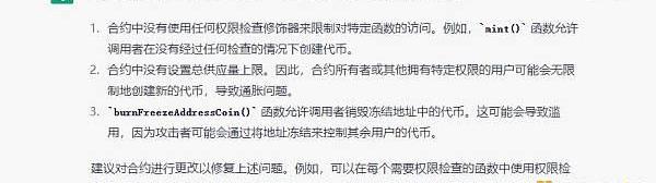 接下来,我们丢给ChatGPT?一个相对简单的但是有漏洞的智能合约,让他检测一下,我们截取部分截图展示。