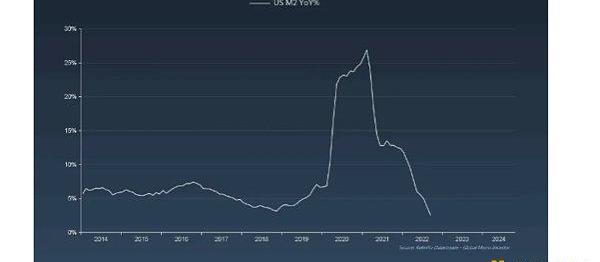 1.宏观经济学:利率/流动性。当M2的同比变化率反弹时,比特币就会呈抛物线式增长——在过度杠杆的健康推动下。当M2同比增长率下降时,BTC就会被压垮。正如我们在下图中所看到的,当M2增加时,BTC的曲线确实从图表中“飞越而出”。那么现在呢?全球M2同比变化率处于8年来的最低点。与此同时,BTC的价格似乎也正在触底——我们稍后会讨论这个问题。