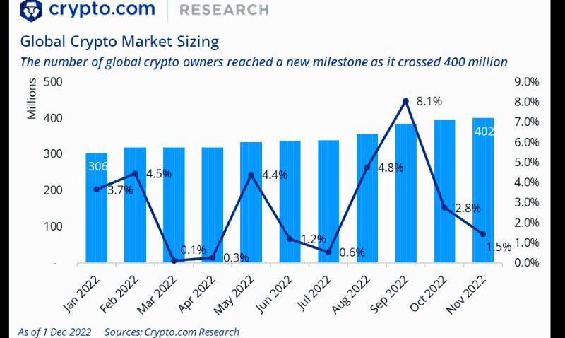 截至2022年11月,加密货币所有者的数量突破了4亿的里程碑,达到4.02亿。在这一年里,月平均采用增长率为2.9%。