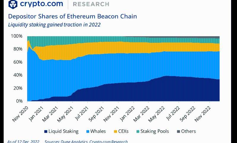 PoS质押默认需要锁定代币,这意味着代币持有人必须在赚取收益或保留流动性之间做出选择。LiquidStaking试图通过让代币持有者享受两全其美的方式来解决问题——在享受PoS代币收益的同时保持一定程度的流动性。流动性质押为质押者提供的灵活性是它在2022年蓬勃发展的一些原因。根据流动性定投代币的市值,ETH是最受欢迎的代币选择。LidoFinance继续引领流动性质押市场,占据约78%的市场份额。