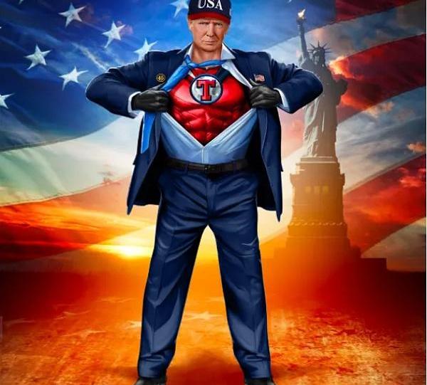 以特朗普数字交易卡#10337为例,这张NFT的卡面是穿着一套超级英雄服装的特朗普站在以自由女神像和挥舞的美国国旗为内容的背景前。