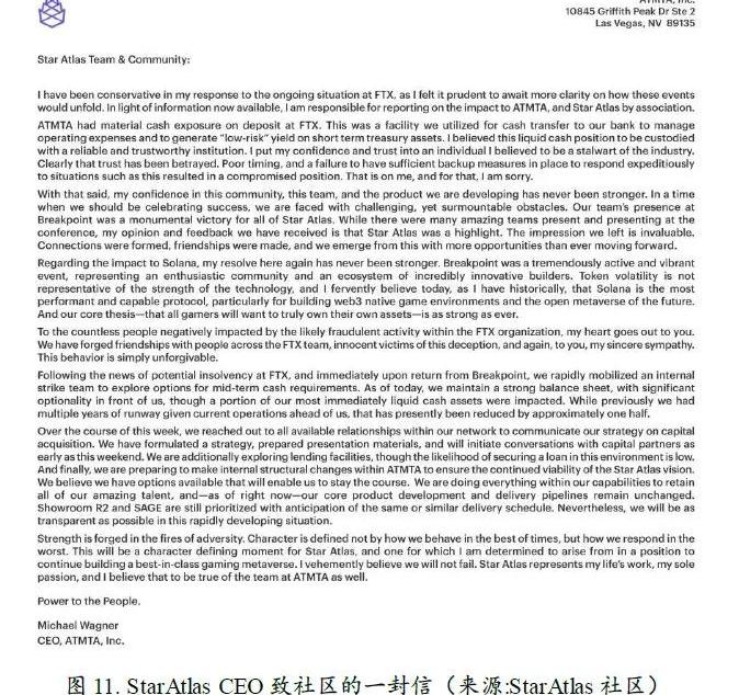 其中,CloneX、Doodles、CoolCats、胖企鹅等NFT几乎没有资金存放在FTX。而影响较大的一个NFT项目是StarAtlas。该项目大约50%???的国库资金存储在FTX上,而且当前游戏开发尚未完成。而我们知道,NFT游戏项目需要大量的资金来开发和运营,这在当前熊市的状况下,毫无疑问是漏船更遭连夜雨。在StarAtlas的CEOMichael给社区的一封信中我们可以看到该项目在缺乏后续资金的情况下可能将无法继续运营。