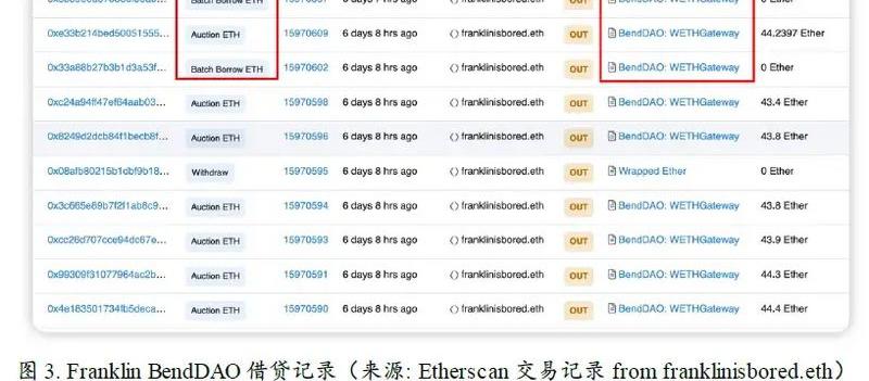 第二,通过抵押BAYC获取ETH,反手低价竞标无聊猿猴。另一方面,Franklin又把自己另外的14个BAYC放到了BendDAO进行抵押,借出ETH。通过借出的ETH和手上的剩余资金在BendDao上进行竞标,竞价区间在?43?ETH—44.3ETH之间。