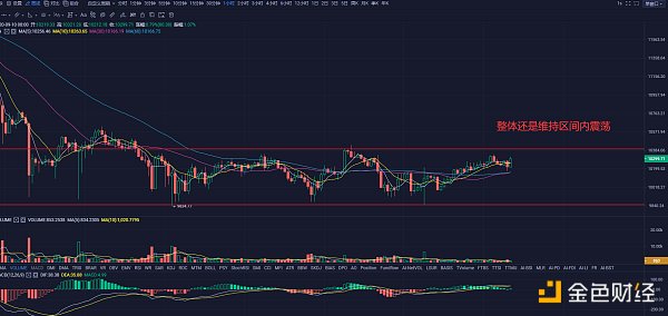 当下行情整体就是震荡走势,所以暂时是看不到什么趋势行情的。而昨天表现稍好一些,表现上是阳线,但不是前几天的那种深度反弹后的阳线,而是稍稍的试探一下10000美元便快速反弹,说明9800美元的支撑暂时还是得到了市场的认可,若是接下来每天的探底位置越来越高的话,那10000美元对大家的心里支撑意义也会越来越大。