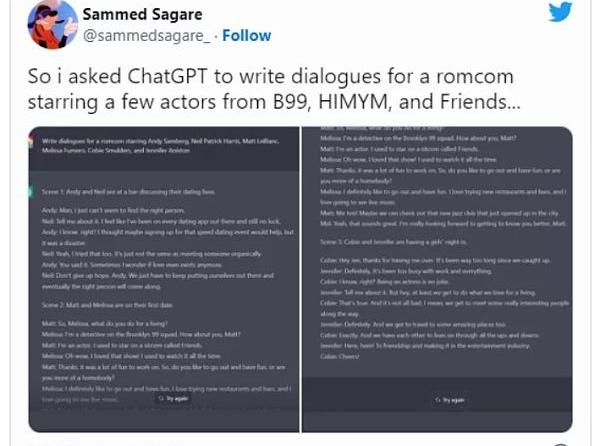 有人用《老友记》等喜剧演员为角色,让它写一些肥皂剧对白,结果惟妙惟肖: