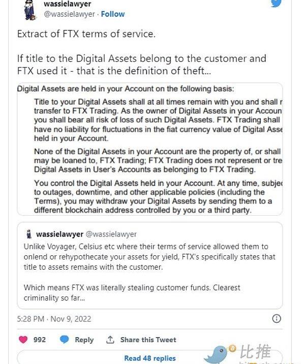 Twitter用户@wassielawyer指出了FTX的用户协议与Celsius和Voyager等的不同之处。Celsius和Voyager的用户协议允许平台临时借用用户资金,而FTX明确写明资金归属权一直属于客户。