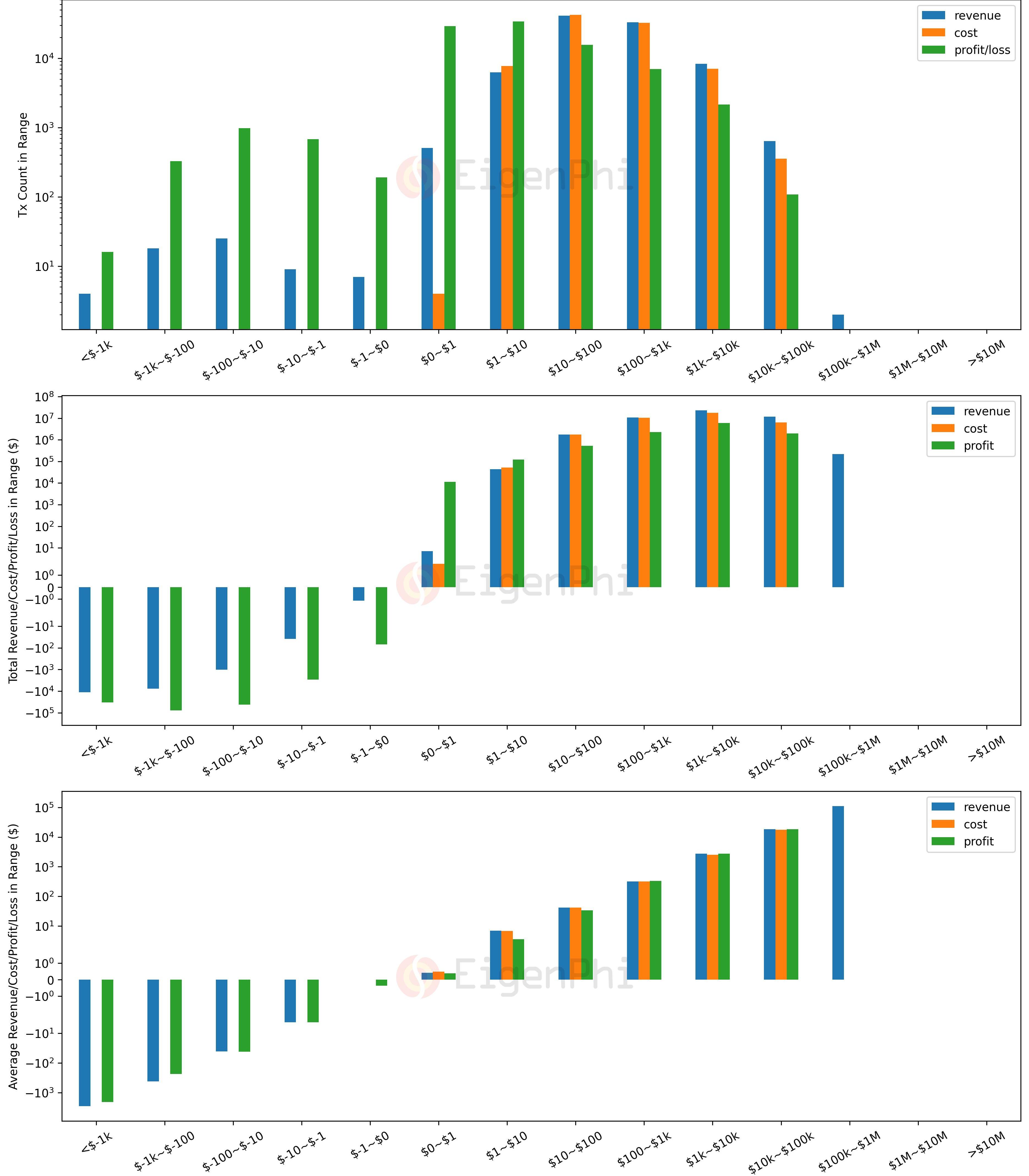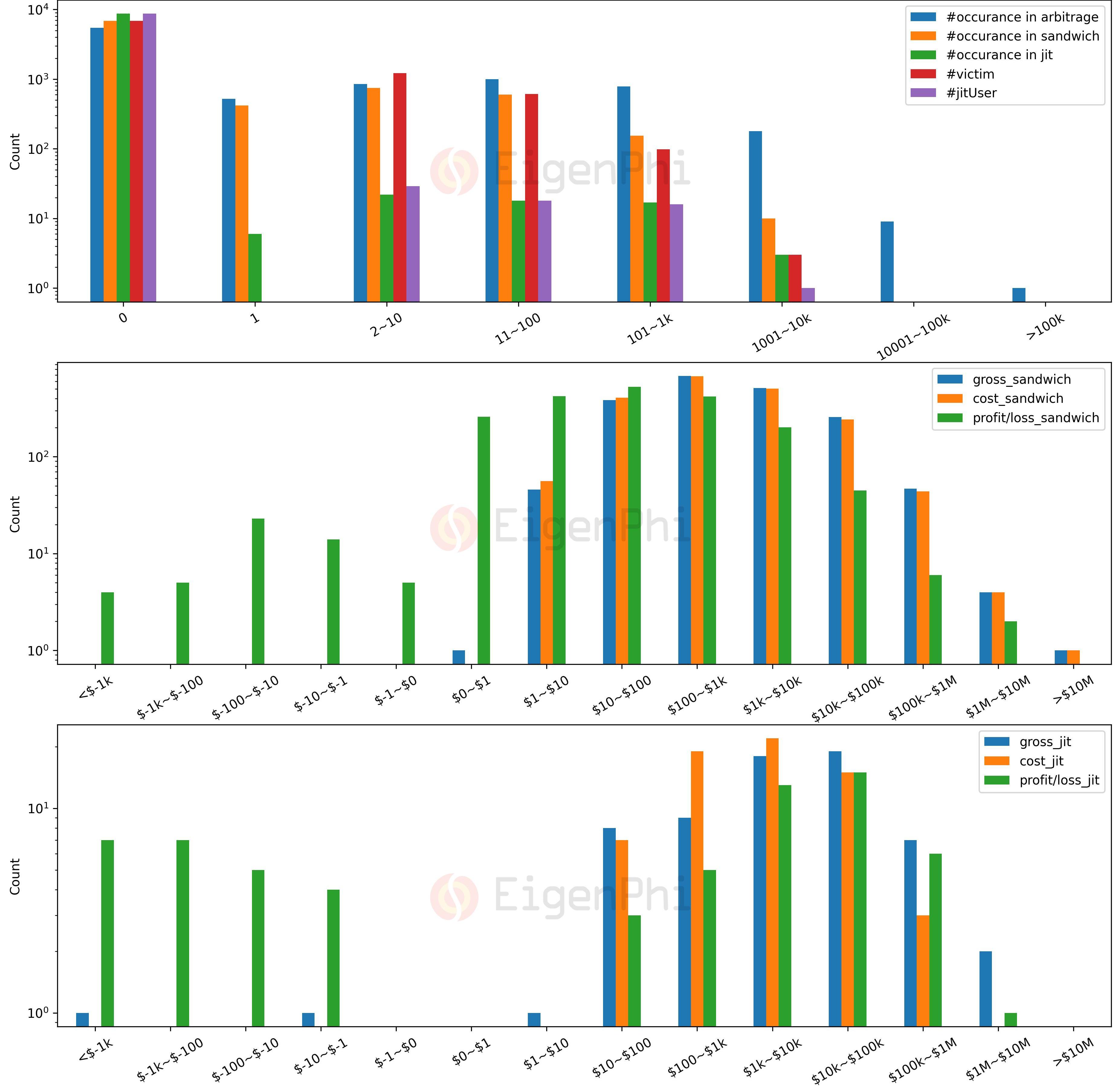 单次观察的盈亏都符合肥尾分布。与套利机器人的盈利能力相比,三明治机器人和JIT机器人遵循相同的分布属性,但它们可以提取的单个观察中的最大利润至少小一个数量级。MEV机器人在一次行动中也会遭受相当大的损失。