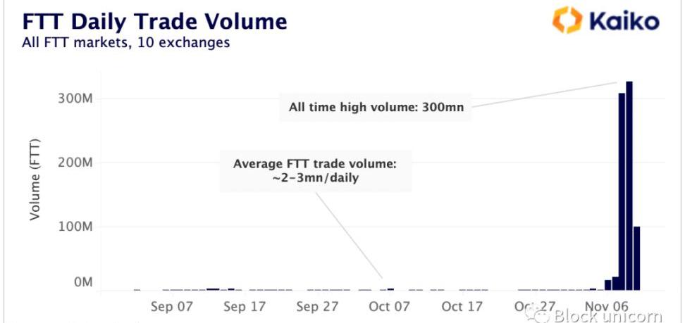 到周二结束时,FTT交易量已飙升至历史新高,单日交易量高达3亿FTT。周三,Binance向所有交易者发出警告,由于极端的风险,停止所有FTT的购买和销售,此后交易量已经稳定下来。