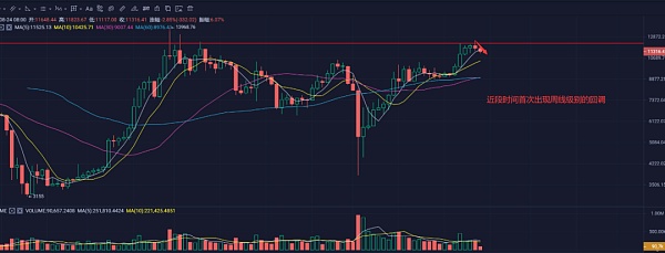 放大到周线级别,表现更为明显,前两次虽然是日线级别的回调,但周线上依然是表现为涨势,而本次回调可以清楚的看到上周周线冲高回落,本周继续回落,在进行周线级别的回调。