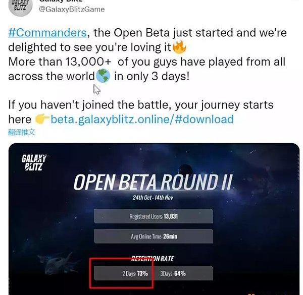 说说我们观察到的项目推广热度吧,GB的推特上有21万粉丝。从项目方推特在10月28号公布的信息,第二次内测有13000多名注册用户,次留达到了恐怖的73%…这些数据说实话我们有点震惊,难道是项目方在欧美那边狂推吗?