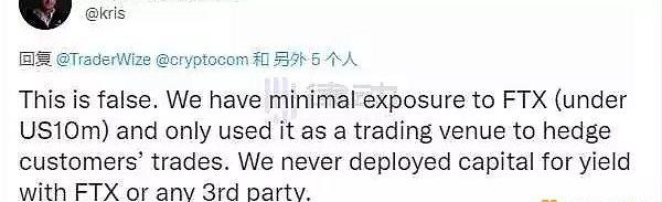 14日,Crypto.com又被曝出曾向FTX转入约10亿美元,并有用户称自己今晨的一笔提现暂未到账,疑似被冻结。对此Kris立刻称「我们对FTX的敞口最小,仅将其用作对冲客户交易的交易场所,从未将资金用于FTX或任何第三方的收益」,并表示Crypto.com在FTX存入USDC是用于购买其他Token,然后转回Crypto.com的钱包。
