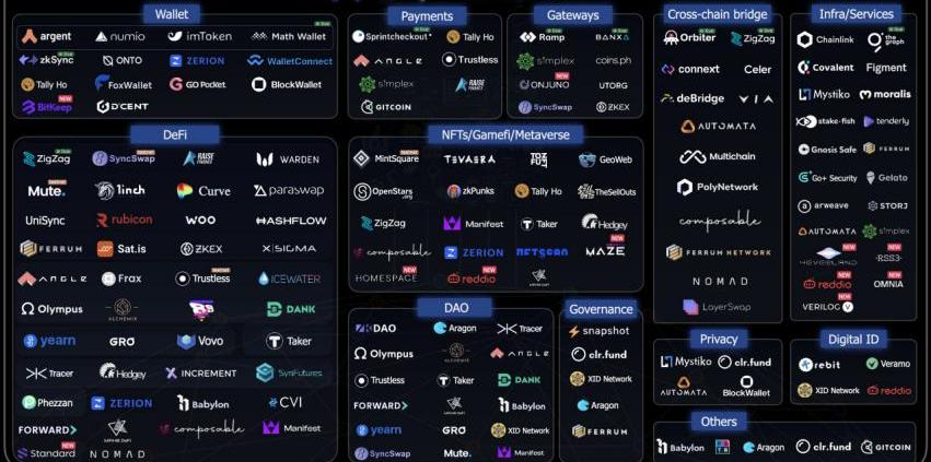 根据zkSync官网生态全景图显示,zkSync生态目前共有160多个项目,涵盖钱包、DeFi、基础设施、支付网关、公共产品、社交、隐私、NFT等多元化赛道。不过这160个项目目前大部分尚未落地,这主要是因为zkSync1.0时期不兼容EVM,导致zkSync上实际可用的原生DApp较为单薄,目前zkSync2.0已上线的项目主要还是集中在钱包、DeFi蓝筹和跨链桥项目上。