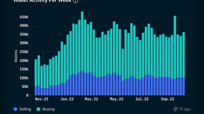这些用户可能是急于卖出退出?并不真地,这些钱包的大部分继续购买——购买频率与年初大致相同。与去年相比,我们现在有更多的用户进行交易。