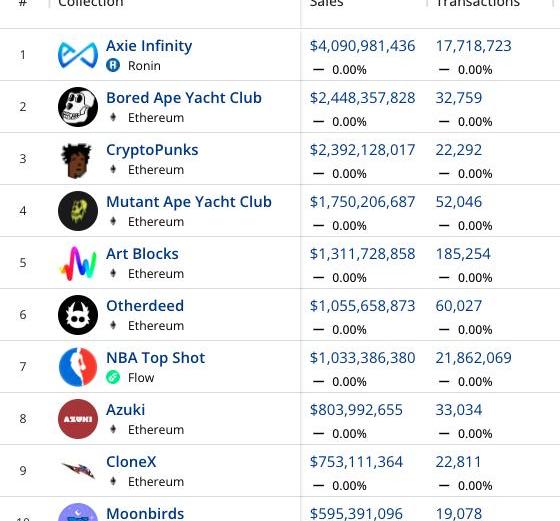 尽管今年有所下降,但AxieInfinity在NFT销量方面仍处于领先地位。迄今为止,SkyMavis的创作已经在他们的个人游戏中完成了约1700万次交易。仅在2100万笔交易中被NBA头号人物击败。