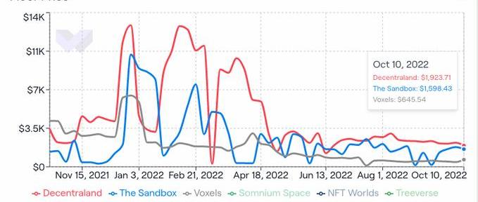出现崩溃的一个领域是虚拟世界中的土地成本。Sandbox和Decentraland平台上的土地底价都下降了约80%。下降的不仅仅是地板价。