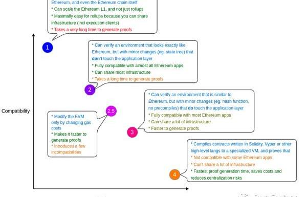 EVM兼容性可能意味着不同的事情。Vitalik最近发表了一篇按类型(1-4)对解决方案进行分类的文章,其中类型1是最兼容EVM的。PolygonzkEVM被称为第3类,向第2类发展,我们对此表示赞同。