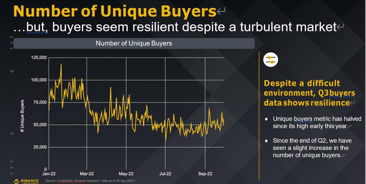 根据截至2022年9月30日CryptoSlam和BinanceResearch的数据显示,尽管市场动荡、环境恶劣,但买家数量似乎有所反弹,三季度买家数据出现了一定程度的回升。