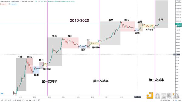 上图为BTC长期周线历史走势,以及三次产量减半的关键时间点,研究发现每个周期包括牛市、熊市、底部吸筹、拉升以及回撤再次吸筹阶段,每一个阶段对应一个箱体区间,目前BTC已完成了第三次产量减半,前期312大跌也并未有效破位中部吸筹箱体区间,整体运行依旧完好,目前已进入前三次一样的牛市箱体区间,只不过属于前期缓涨底部抬高的慢牛走势,后期将迎来加速冲顶的快牛行情,虽然历史不会简单重复,不过通过研究可以预测未来大概走势,目前整体走势依旧运行完好,区间箱体并未破位,大方向依旧保持对后市的看好。