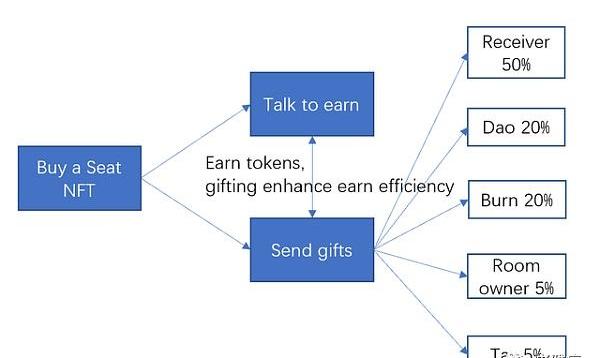 用6个座椅NFT燃烧出1个房间NFT,给持有座椅NFT的人提供房间赚币。对房间里发生的送礼行为,大概抽佣5%,躺赢。