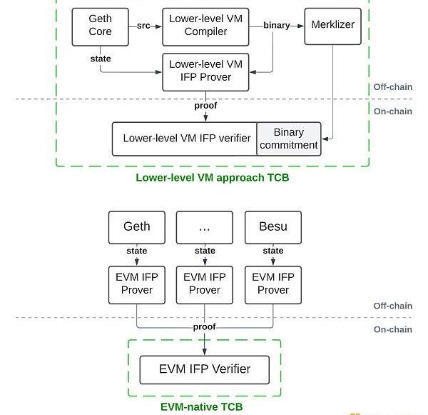 EVM本地和较低级别的VM方法都在TCB中包含一步形式验证者。虽然较低级别的VM验证者可能更易于实施和审计,但考虑到端到端实施和/或审计系统其余部分的难度——尤其是客户端和编译器。