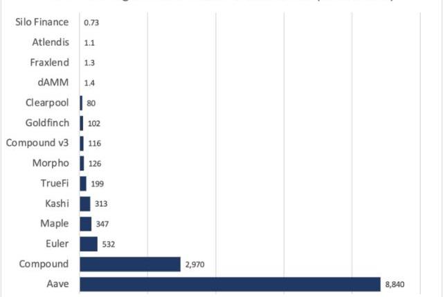 到目前为止,AAVE是明显的赢家,部分原因在于其积极的多链部署——其总TVL的37%位于L2或EVM上。COMPv3从v2迁移资金的速度很慢,v2稳居第二位,Maple是最受欢迎的抵押不足贷款协议。