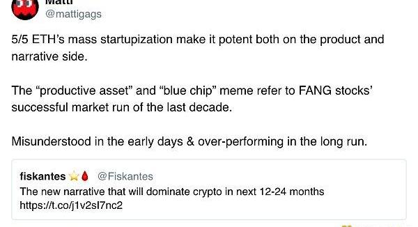 以太坊的大规模合并使其在产品和叙事方面都很强大。“生产性资产”和“蓝筹加密货币”的meme指的是过去十年中FANG股票的成功市场运行。早期被误解,长期来看表现出色。这将在未来12-24个月主导加密货币的新叙事