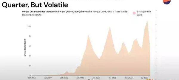 3)DEX:托管ETH钱包的每日活动地址略有下降。但单一DEX买家每个季度上涨了5.5%。自六月以来,DEX交易量整体回落了90%。相比CEX,DEX交易量回落更快。