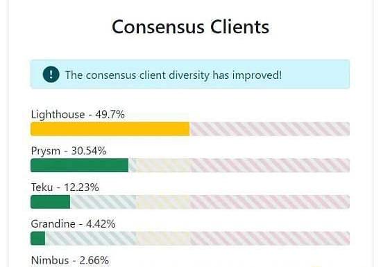 在这一点上,共识层分布有了很大的改善。几个月前,Prysm在所有共识客户中占75%。