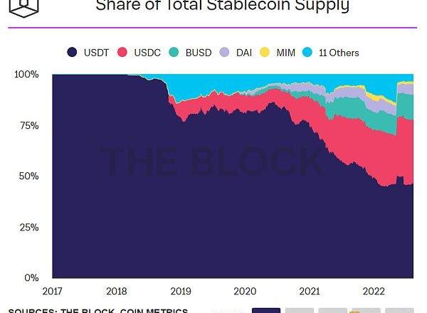 尽管未经验证,但衡量DeFi参与规模的行业指标包括在以太坊智能合约中“锁定”稳定币的百分比。以太坊目前是DeFi协议和应用程序运行的主要区块链。这就是为什么“合并”是区块链历史上最受期待的事件之一,一旦过渡完成,就会引发许多关于稳定币稳定性的问题。