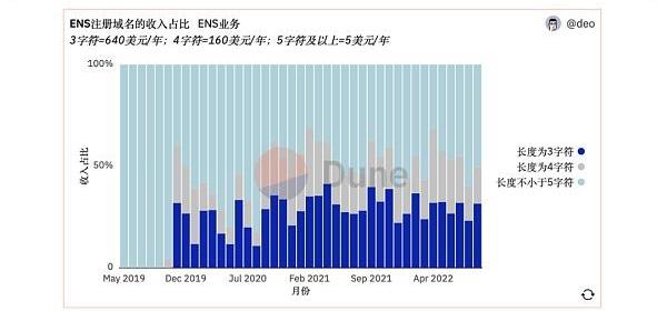 从业务收入来看,具有用户粘性的域名收入构建了项目的安全边际。ENS对单个注册的域名收取固定的年费,根据字符长短有所不同,那么项目的平均年收入为,近一年平均的域名年收入为27.3美元,目前注册量约235万,可得年收入约6415万美元。域名业务有较强的粘性,而ENS域名映射身份,随着数字身份的发展,这种粘性会加强。