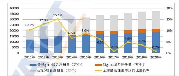 传统域名市场已经接近饱和。随着互联网快速发展,域名市场在过去20年增长迅速,但目前已经接近饱和。根据中国信通院数据,截至2020?年底,全球域名注册市场规模为3.74亿个、我国域名注册市场规模为4300.8万个,其中新通用顶级域域名注册市场规模分别为3125.2万个和718.1万个,较上年有一定下降。
