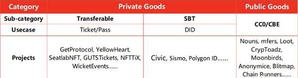 简单地,我们可以根据NFG针对所具备的不同将其划分为私有型和公共型两类。其中私有型又可以细分为可转让(Transferable)与不可转让/灵魂绑定两种范式,公有型主要以CC0/CBE(can’tbeevil)叙事为代表进行讨论。