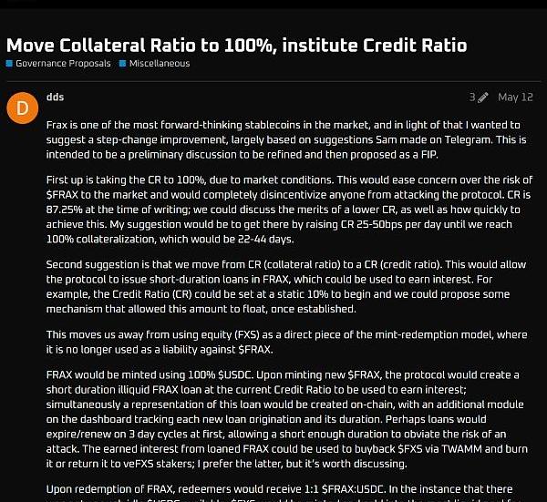 提案来源:https://gov.frax.finance/t/move-collateral-ratio-to-100-institute-credit-ratio/1371