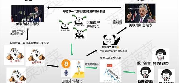 有涨便有退,降息不可能永远进行下去,然后便是第二波:退潮阶段。与降息放水相反,让水量收缩,自然就是加息了,这个词在美联储现任主席鲍威尔这几个月的喊话中威力尽显,每喊一次都能让大家口袋里的钱飞走一部分,下图将简单描述美元霸权如何利用美元潮汐如何在加密市场中进行收割。