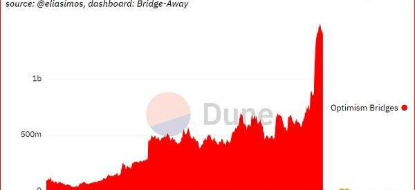 而6月1日OP代币刚发行时,跨链桥TVL仅6.67亿美元,它在两个半月的时间整体上涨了113.94%。